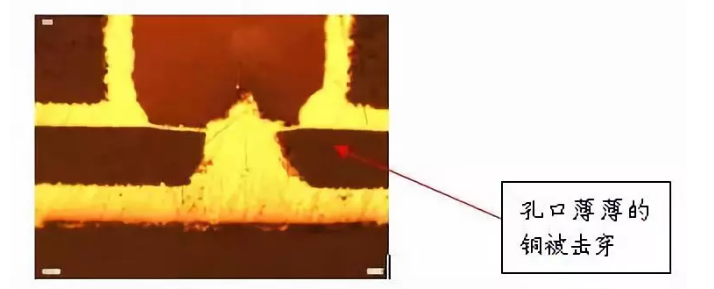 目前在行業(yè)通行的標(biāo)準(zhǔn)(IPC-650)里面,似乎還沒有給出對(duì)于樹脂塞孔的孔上面銅厚的要求,潛在的風(fēng)險(xiǎn)是,一旦樹脂塞孔的孔上面電鍍的銅厚偏薄,經(jīng)過內(nèi)層HDI線路的表面處理,棕化處理以后,孔口上面的薄薄的銅會(huì)有被激光鉆孔鉆穿的可能,而且在電測試時(shí)是無法判定其有問題的。但這層薄薄的銅在耐高壓等方面的品質(zhì)著實(shí)讓人擔(dān)憂。